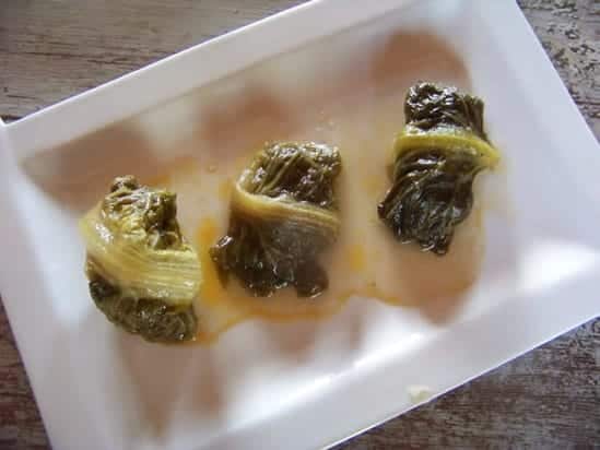 Trempez les feuilles dans l’eau bouillante 1 à 2mn, juste le temps qu’elles ramollissent, puis retirez-les avec une écumoire.