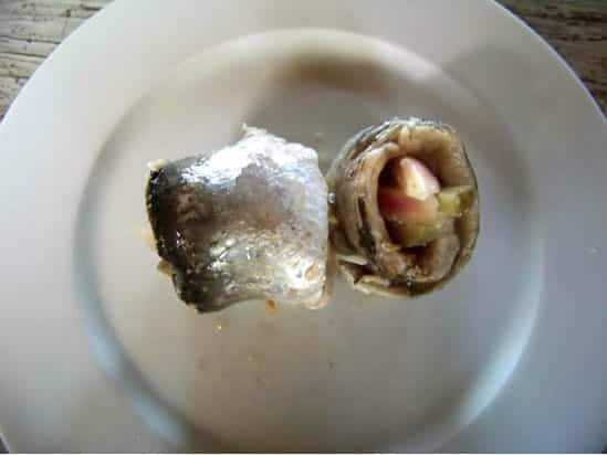Posez un filet de hareng, placez à l’intérieur un peu de cornichon et d’échalote, puis roulez-le (voir photo)