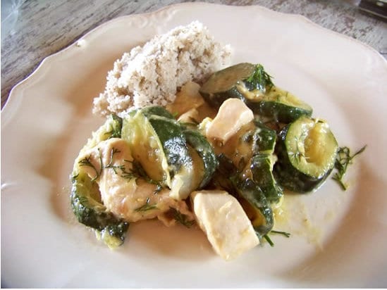 Accueil » volailles » poulet » Sauté de poulet aux courgettes, aneth, carvi et crème d’amandes