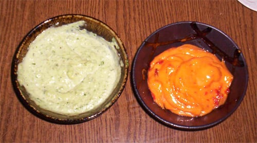 Hachez les herbes, les cornichons et les câpres. Réservez dans un bol. Ouvrez les piments en 2. avec un couteau, raclez bien la pulpe et laissez la peau. Pilez cette pulpe au pilon pour la transformer en pâte. Réservez dans un bol. Séparez la mayonnaise en 2 et mélangez-en la moitié avec les herbes et l’autre moitié avec le piment. Servez les deux sauces avec viande, poisson ou fruits de mer.