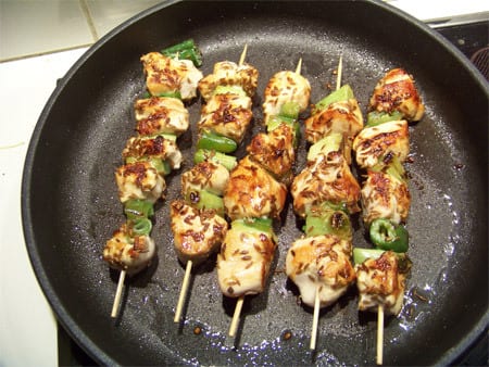 • 4 filets de poulet,3 oignons blancs avec la tige, sel, 1 C.A.C. de graines à roussir, huile d'olive, 1 citron vert, 1 piment vert frais (facultatif), piques à brochettes