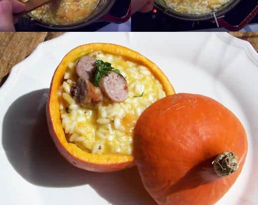 Pendant ce temps disposez les potimarrons évidés dans les assiettes, remplissez-les avec le risotto et décorez avec un peu de persil haché et quelques rondelles de saucisse.